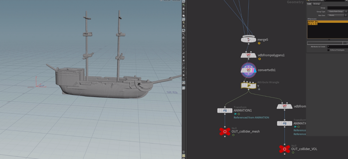 For Cloth solutions, Alejandro focused on utilizing the power of Vellum Solver. The Vellum solver was used in its Cloth configuration and used for the characters cloth and the ships sails. Utilizing creative ways to overlap multiple layers of cloth, the wizard was able to inherit unique artistic qualities both in his fashion and gravitational effects.